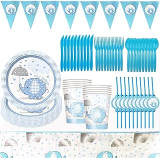Gebutstag Party Set,LLMZ 62-teiliges Party Set Baby Elefant Teller, Tassen, Tischdecken, Besteck, Strohhalme Baby Elefant blau Party Set für Geburtstagsfeiern, Innen- und Außenpartys, Picknicks